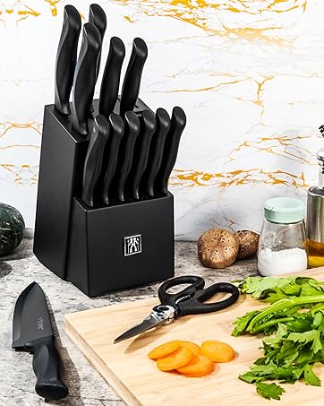 ALL-IN-ONE KITCHEN KNIFE SET – 15-piece knife set includes. 8″ chef’s knife, 8″ slicing knife, 7″ Santoku knife, 8″ serrated bread knife, 5″ utility knife, 3.5″ paring knife, 6 4.5″ serrated steak knives, 1 kitchen shear, knife block with built-in knife sharpener