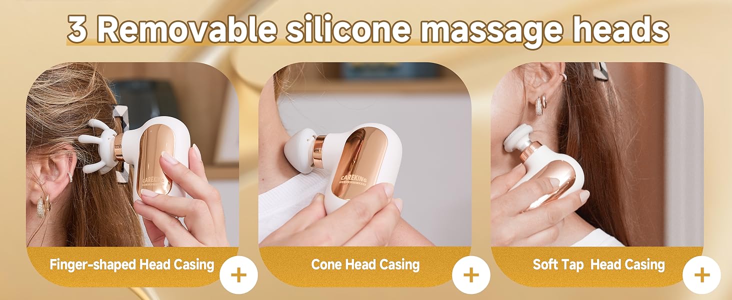 【3 + 1 Massage Heads for Targeted Relief】- Includes 3 Interchangeable silicone heads plus 1 fixed flat head for precise massage. Finger-shaped head is suitable for for sensitive areas like the scalp and neck, tapered head targets trigger points and feet, soft tap head helps open facial pores, and flat head is ideal for shoulders, back, and thighs. For gentle areas like face or scalp relaxation, please choose 800 RPM for a soothing massage experience