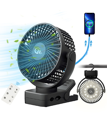 【Used As Portable Charger, Emergency Using】Built-in 12000 mAh high battery capacity, you can use this battery fan as a power bank that provides the backup power source for smartphone. Its compact size and smart design bring you the most convenience in daily personal usage, such as hanging tent fans for camping, RV fan for ceiling, personal fan for desk, clip fan for bed, stroller fan with light. What You Get: 1 x Clip Fan with Remote Control(Black); 1 x USB Type-C Cable; 1 x User Manual.