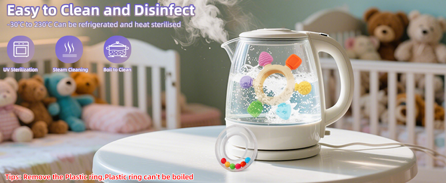 Easy to clean and Disinfect: The Baby Teethers are resistant to high and low temperatures, can be boiled, steam or refrigerated,-50° to 230°,you can wash the baby toys with mild soap and water or boil to sterilize (Notice: the plastic ring can’t be boiled, please remove it)The plastic ring can be cleaned by flowing water or wet clean towel.Please wash teething toys before use