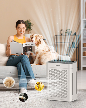 DUAL SIDE AIR INTAKE & LARGER COVERAGE: DBFIT AP300 air purifiers for home feature a double-sided air intake design that cleans air on both sides simultaneously, purifying twice as fast as traditional single-intake models. This large room air purifier covers an area up to 3000 ft²and refreshs a room of 533 ft² rapidly in just 10 minutes. The high-efficiency HEPA air purifier captures 99.97% of airborne particles, ensuring a smoke-free, dust-free, allergen-free, and odor-free environment for you and your family!